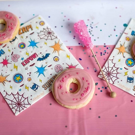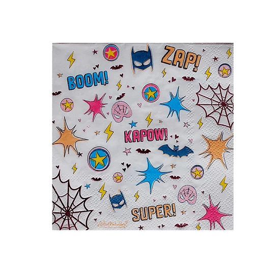 20 serviettes en papier anniversaire Superheros. Pour une soirée entre amis, voilà un adorable lot de 20 serviettes en papier jetable décorées de motifs superheros sur fond blanc. Ces assiettes en papier vous permettront d’habiller vos tables d’anniversaire. Ce lot de serviettes jetables sont parfaites pour les petits et les grands.