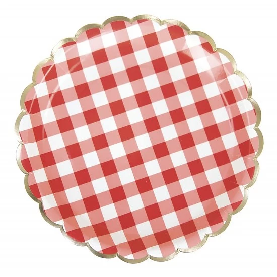 Assiette en carton Vichy rouge et Blanc Guinguette – Lot de 8. Pour un chouette moment entre amis, un anniversaire ou une soirée, adoptez ce lot de 8 assiettes en papier jetables au bord festonnés et dorés ! Pleines de bonne humeur, ces 8 assiettes en carton sont parfaites pour égayer vos soirées d’anniversaire. Ces assiettes jetables décorent votre table avec une touche d’originalité en y faisant reigner un air de guinguette en bord de Seine