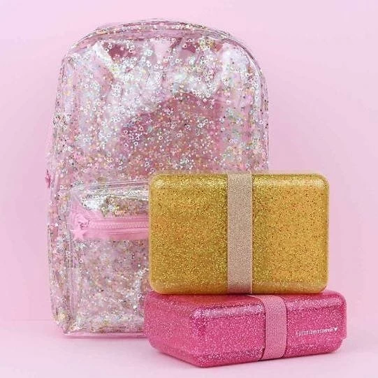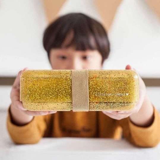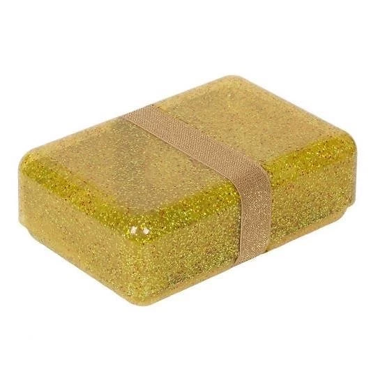 Boite à gouter rectangulaire à paillettes doré, avec élastique de fermeture. Une jolie lunch box pour y transporter l’indispensable en cas de petite (et grosse) faim. La taille parfaite pour de gros sandwichs !