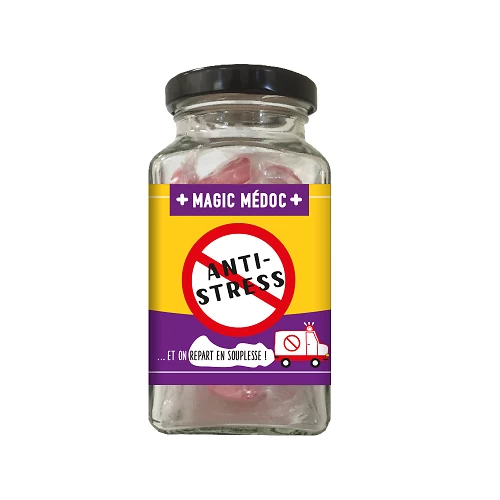 Bonbons Magic Médoc – Anti Stress. Bonbons magiques coeur en verrine de 90g. Indispensables en cas de gros stress, grosses paniques, petites inquiétudes et tracas de toutes sortes ! Un traitement efficace qui permet de tout affronter avec souplesse ! Efficace et naturel !