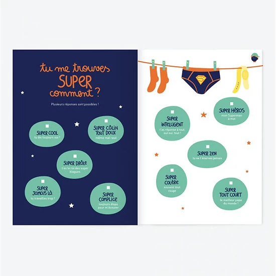 Le cahier père / fils – Tel père telle fils est un cahier à remplir entre père et fils. Une occasion de passer un beau moment de complicité ensemble. Une citation bien célèbre à découvrir dans ce merveilleux livre à remplir. Passez un moment entre père et fils pour en apprendre plus l’un sur l’autre. C’est l’occasion de partagez des moments d’émotions sans tabou ni détour avec une touche d’humour.