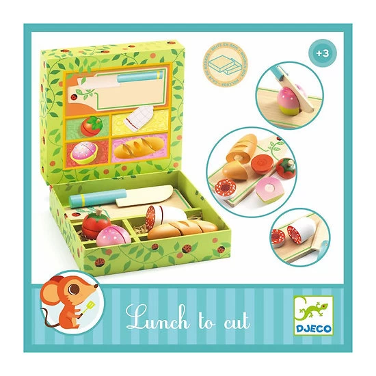 le lunch à couper de Djeco, une dinette en bois avec des aliments à découper pour les enfants à partir de 3 ans.