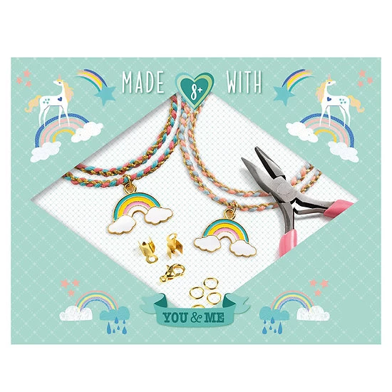 Duo de bracelets à fabriquer – Kumihimo Arc-en-ciel. Un super coffret créatif pour créer seul ou a plusieurs 2 magnifiques bracelets. Un livret explicatif est inclus pour accompagner l’enfant dans ses créations. Ce coffret contient 4 charms, 1 pince, 1 disque de tressage illustré et en mousse, 5 x 4 mètres de fils à tisser, 4 fermoirs, 2 aiguilles, 1 livret explicatif, 2 sacs en organza et 2 cartes illustrées.