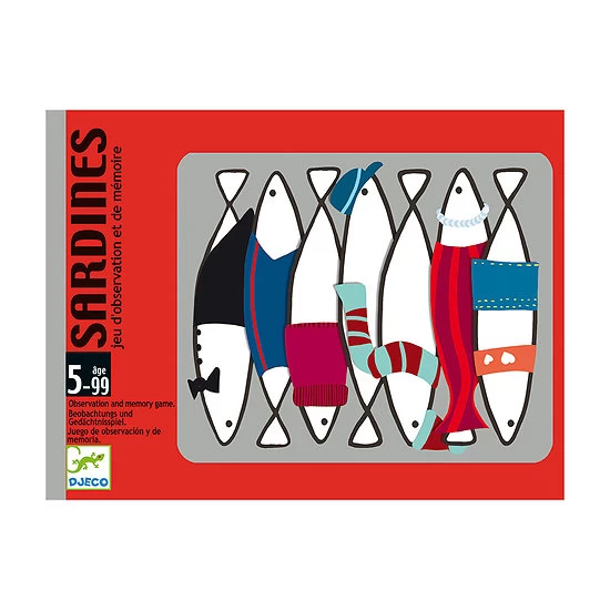 Un très bon jeu pour travailler sa mémoire visuelle avec de drôles de sardines costumées. Des cartes colorées et amusantes présentées dans une boîte de jeu compacte, un jeu de voyage à emporter partout.