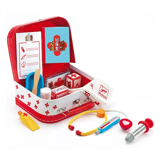 Jouet en bois – La mallette du docteur est l’accessoire indispensable du médecin. Cette malette est à emporter partout pour soigner les poupées et les doudous blessés. Composé de 10 pièces de jeu, ce coffret est très complet. Ce jeu est pour certains le premier pas vers une grande carrière de médecin !