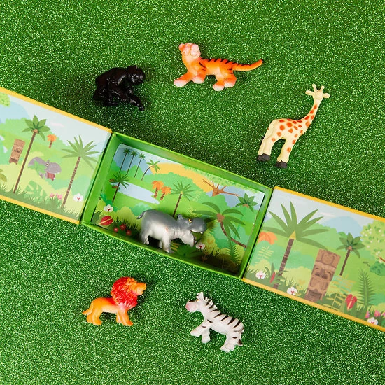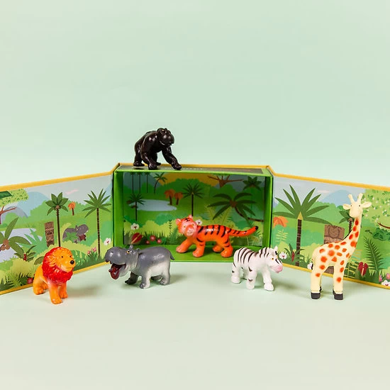 La tribu de la jungle – 6 animaux de la jungle en boite. Avec la boite de la tribu de la jungle, vous pouvez emmener la jungle PARTOUT avec vous ! Imaginez mille et unes incroyables aventures avec cette petite boite en poche. Une petite boite contenant en permanence vos six terribles mais non moins sympathiques mini habitants de la jungle et de la savane. Bien rangés dans leur boite, le gorille, le zèbre, le lion, la girafe, l’hippopotame et le terrible tigre attendent de vivre leur prochaine histoire. On aime : la boite compacte et facile à transporter qui une fois ouverte offre une toile de fond paysagée géniale.