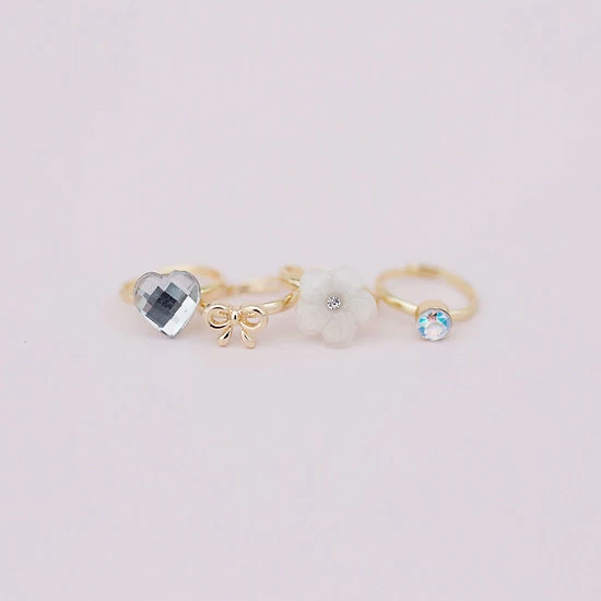 Lot de 4 bagues enfant Diamant et Nacre. Faites briller les yeux et les mains de votre enfant avec ces magnifiques bagues nacrées et réglables. Chaque bague de ce set de 4 pièces possède un motif délicat. Le tout sur un anneau doré parfaitement adapté aux petits doigts des enfants. Un cadeau qui fait plaisir à toutes les petites filles.
