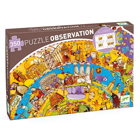 Découvrez le puzzle d’observation Histoire de Djeco, un magnifique puzzle rond de 350 pièces avec livret pour les enfants dès 7 ans. Votre enfant va reconstituer son puzzle et feuilleter le livret pour découvrir les différentes périodes de l’histoire à travers la préhistoire, l’antiquité, le moyen-âge, l’époque moderne et l’époque contemporaine.